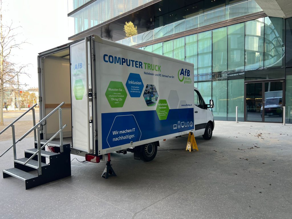 Mit dem Computertruck wird gebrauchte, zertifiziert gelöschte Hardware direkt zu Unternehmen, Schulen und Gemeinden gebracht.
